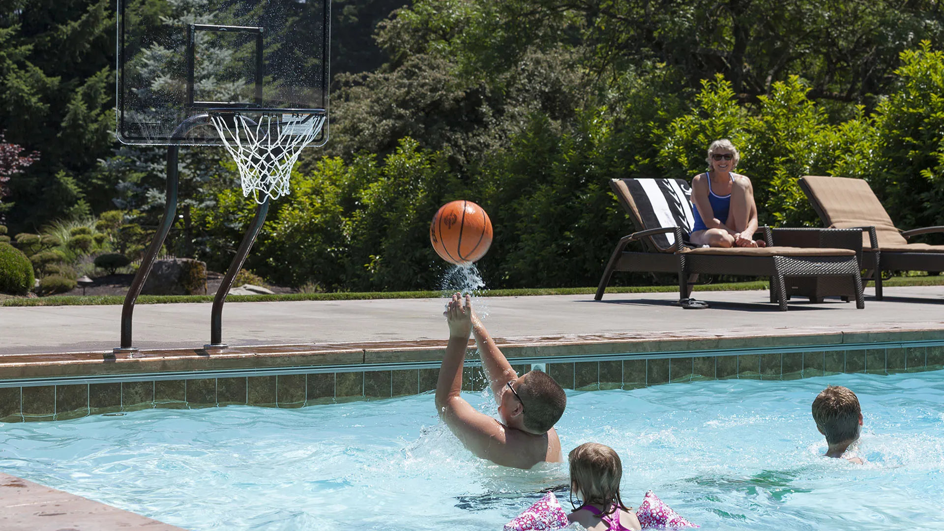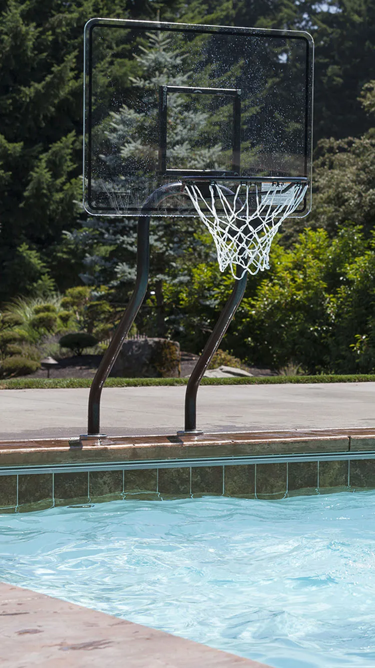 - Continuous dual post frame design - SealedSteel® vinyl-coated frame and rim resists corrosion - Removable unit with included plastic anchor caps that sit flush with deck - Regulation rim, net, basketball and needle included