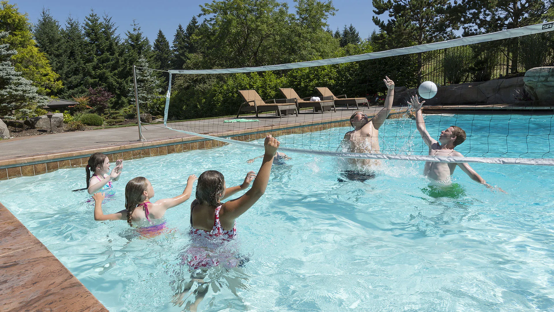 Swim N' Spike Volleyball pool game includes vinyl-coated posts, a 6 metre competition quality net, water volleyball and needle. Easy setup with endless fun.