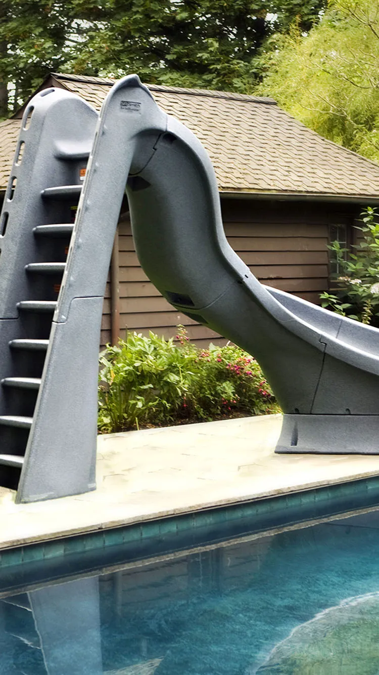 - Heavy-duty rotomolded construction - Available in right or left curves - 2.6 meters in height to hand rails - Big ride, with 4.4 meter flume - High volume water delivery system - Accommodates sliders up to 124 kg - Enclosed ladder and molded handrails for maximum safety